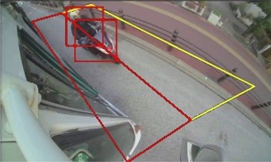 オートバイの接近に対して、レッドゾーンで危険を検知